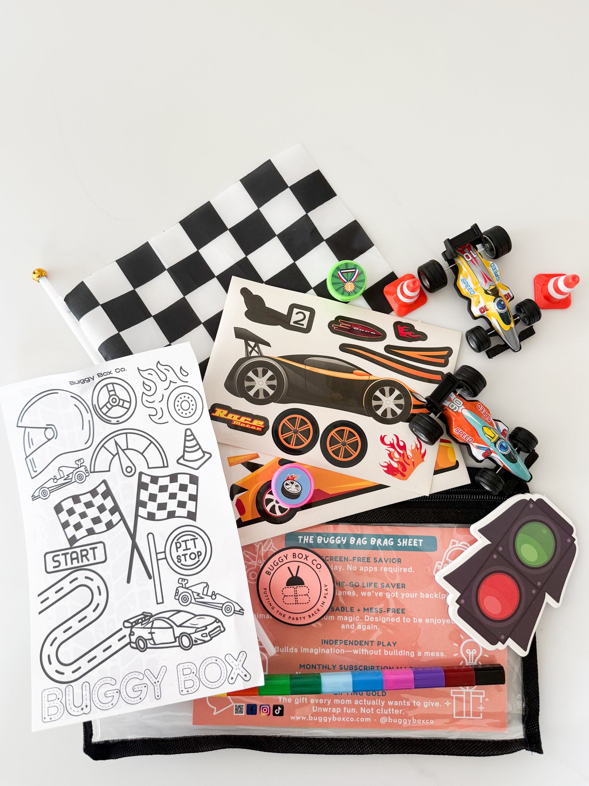 Each Race Car Buggy Bag includes carefully curated, reusable activities kids actually want to play with: